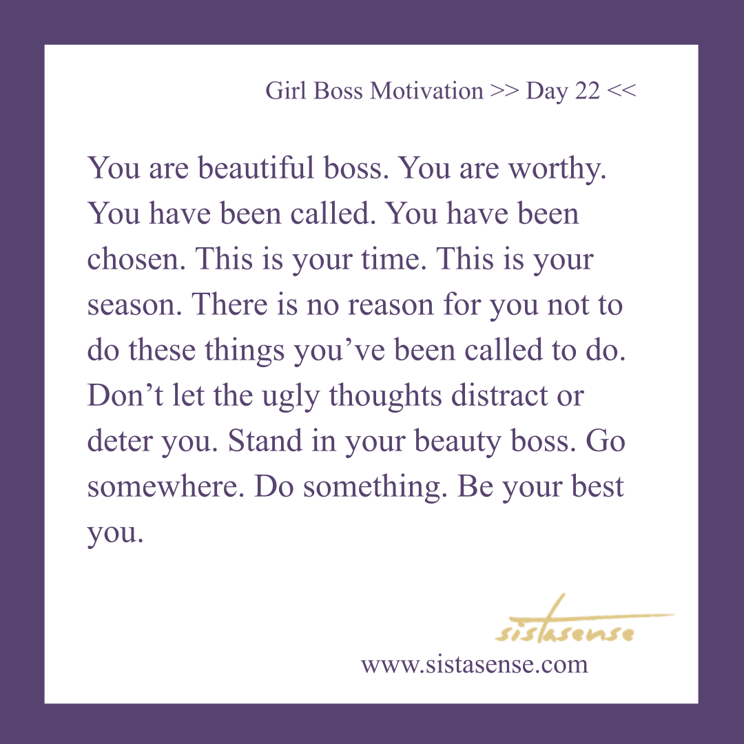 You are beautiful. boss. You are worthy. You have been called. You have been chosen. This is your time. This is your season. There is no reason for you not to do these things you’ve been called to do. Don’t let the ugly thoughts distract or deter you. Stand in your beauty boss. Go somewhere. Do something. Be your best you.