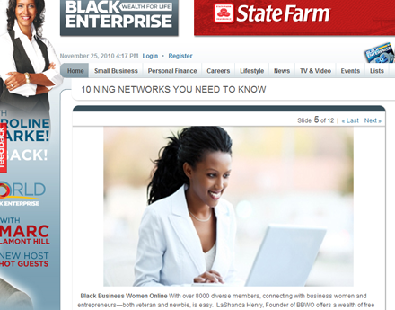 I woke up this morning and grabbed my iPhone. My last thought last night was to go download the ‘Black Enterprise App’, so I woke up with that on the brain. Imagine my surprise when I got to the website and discovered my social network – Black Business Women Online (www.mybbwo.com) featured in a BE Article: 10 Ning Networks to Know. This is my second time being featured in an article on Black Enterprise.com, I am honored and truly appreciative of the support BE has given to my social network for women entrepreneurs of color! This is truly a great Thanksgiving! -lh