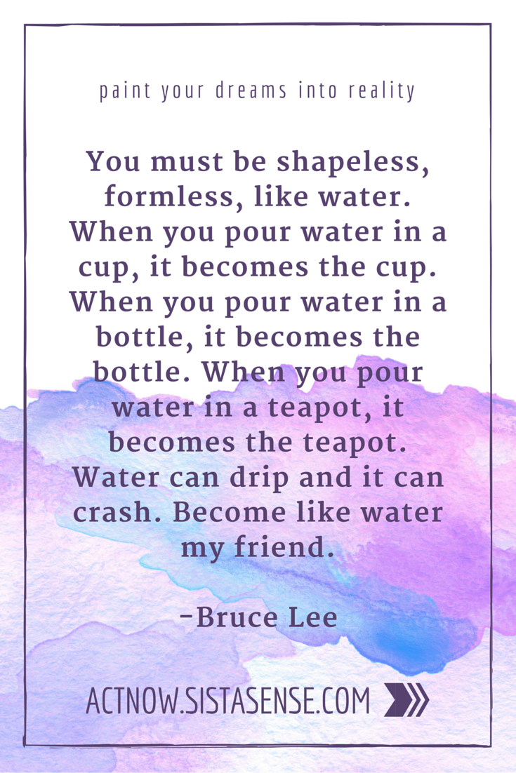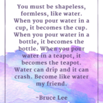 - You must be shapeless, formless, like water. When you pour water in a cup, it becomes the cup. When you pour water in a bottle, it becomes the bottle. When you pour water in a teapot, it becomes the teapot. Water can drip and it can crash. Become like water my friend. -Bruce Lee